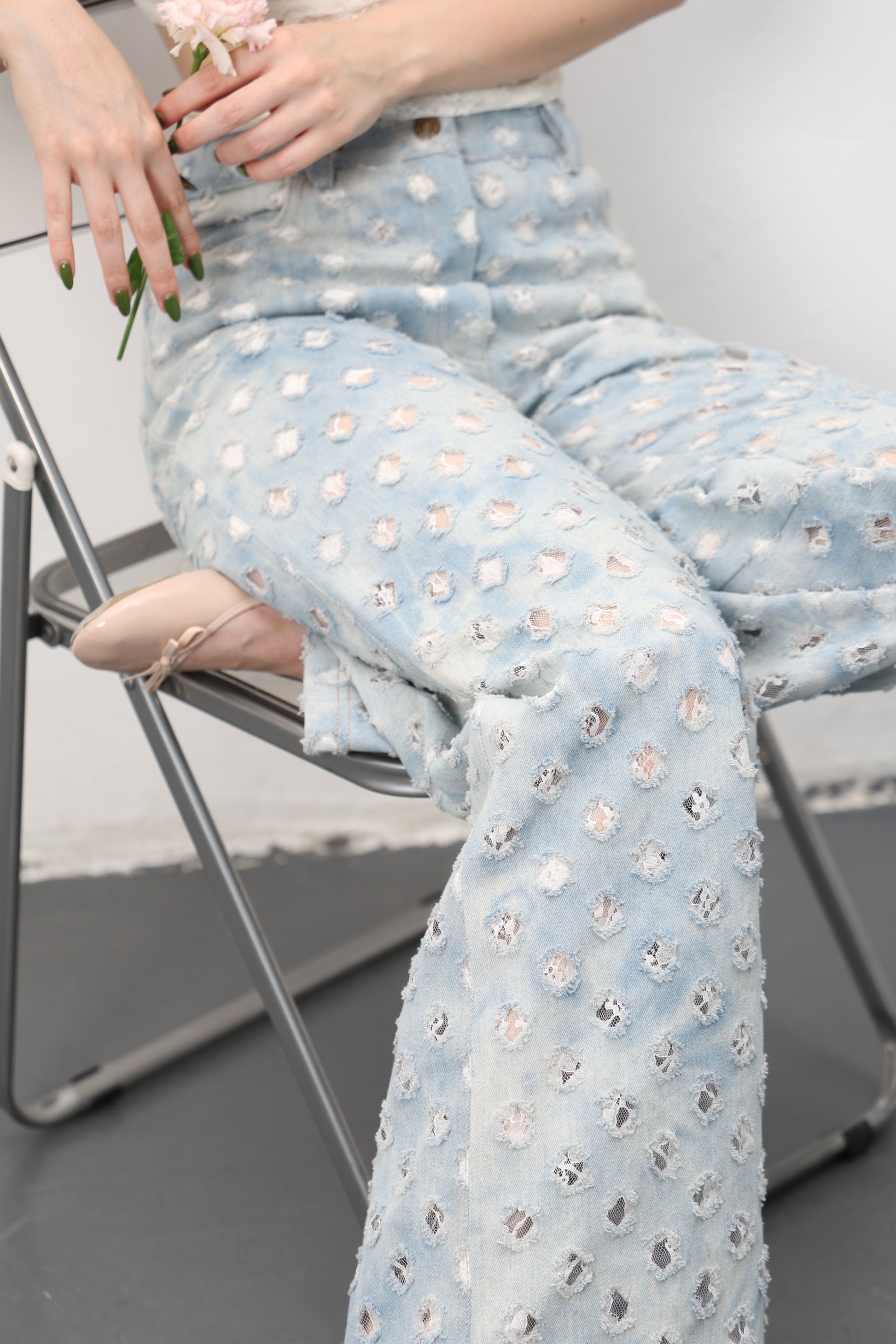 Denim jeans stand out with their lace-inspired cutout dot design, adding texture and a playful edge to a classic look. The relaxed straight-leg fit makes them easy to style for both casual and statement outfits.