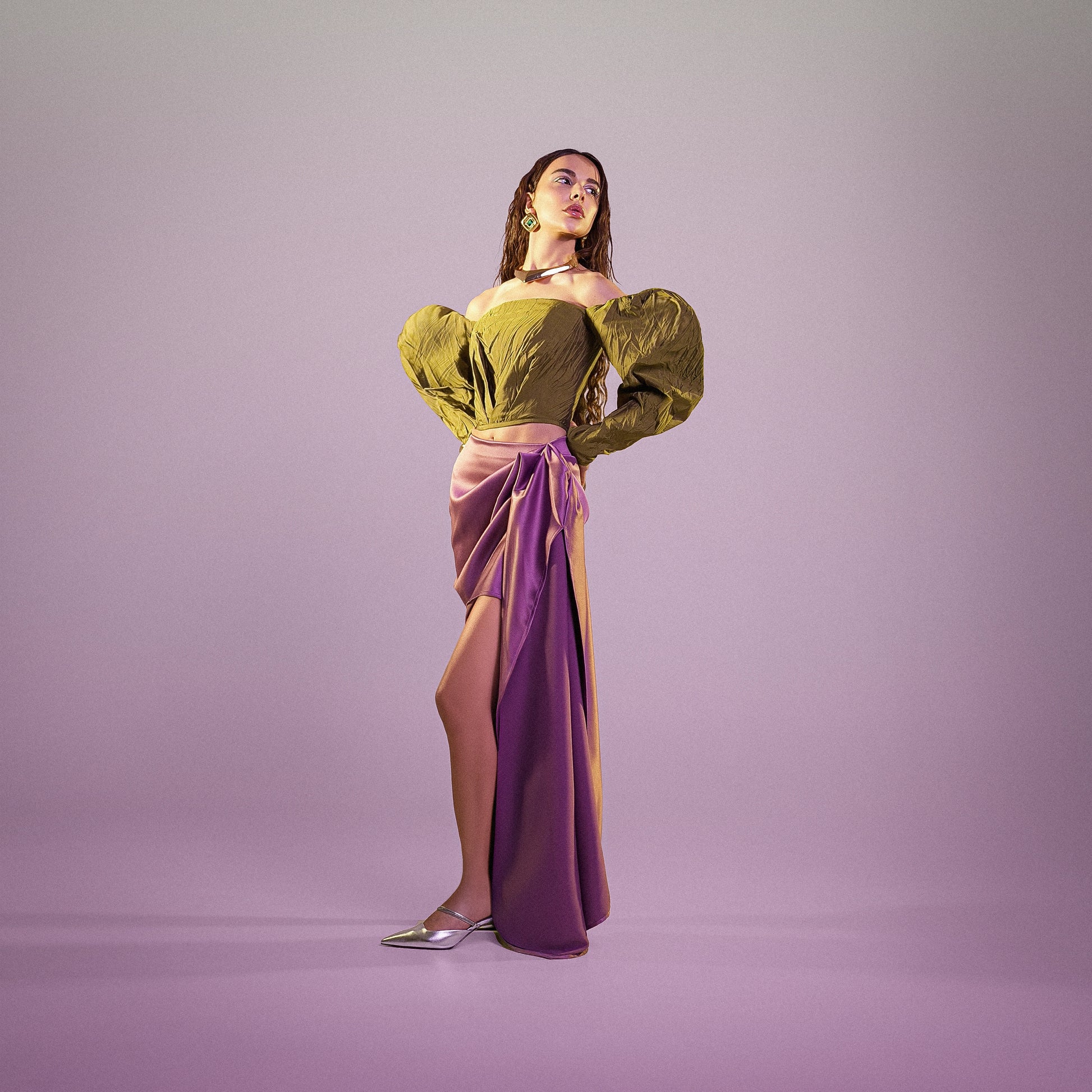 This off-shoulder corset blends structured elegance with a touch of drama. Designed with voluminous, puffed sleeves, it exudes a bold, regal aesthetic while maintaining a feminine silhouette. The rich, textured fabric and tailored construction hug your body perfectly, accentuating your waist and shoulders.