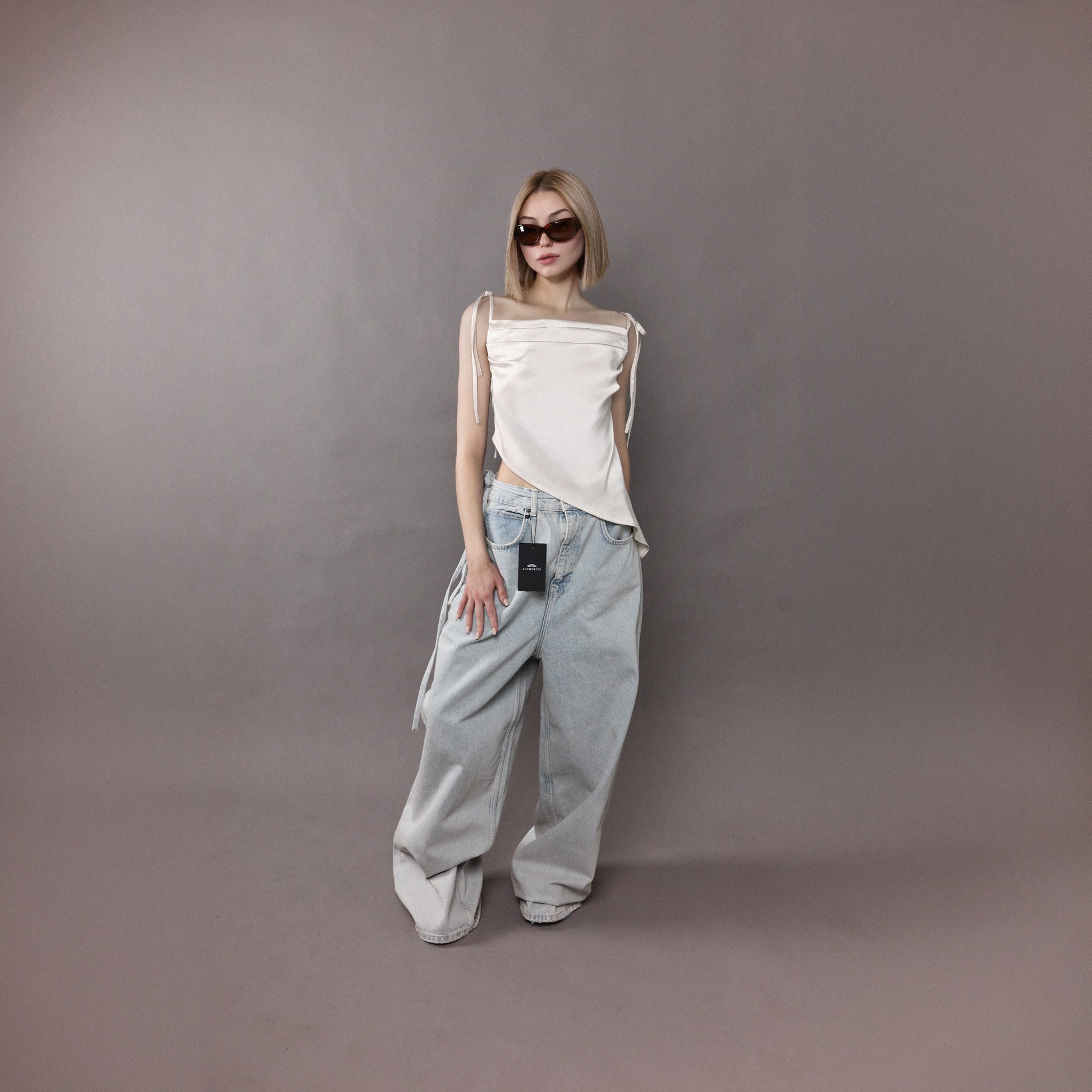 Crafted from soft, lustrous satin, this top features delicate adjustable tie straps, ensuring a customizable and flattering fit. The asymmetrical hemline and gathered drape detailing add a sophisticated touch, making it perfect for versatile styling. Pair it with tailored pants for a polished look or denim for a chic, casual vibe.