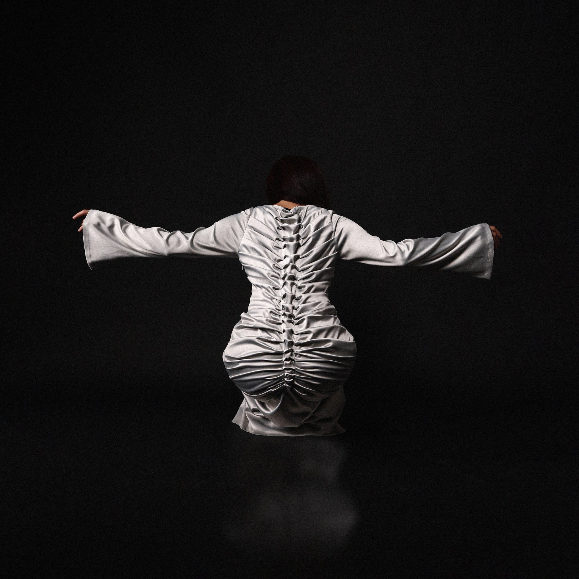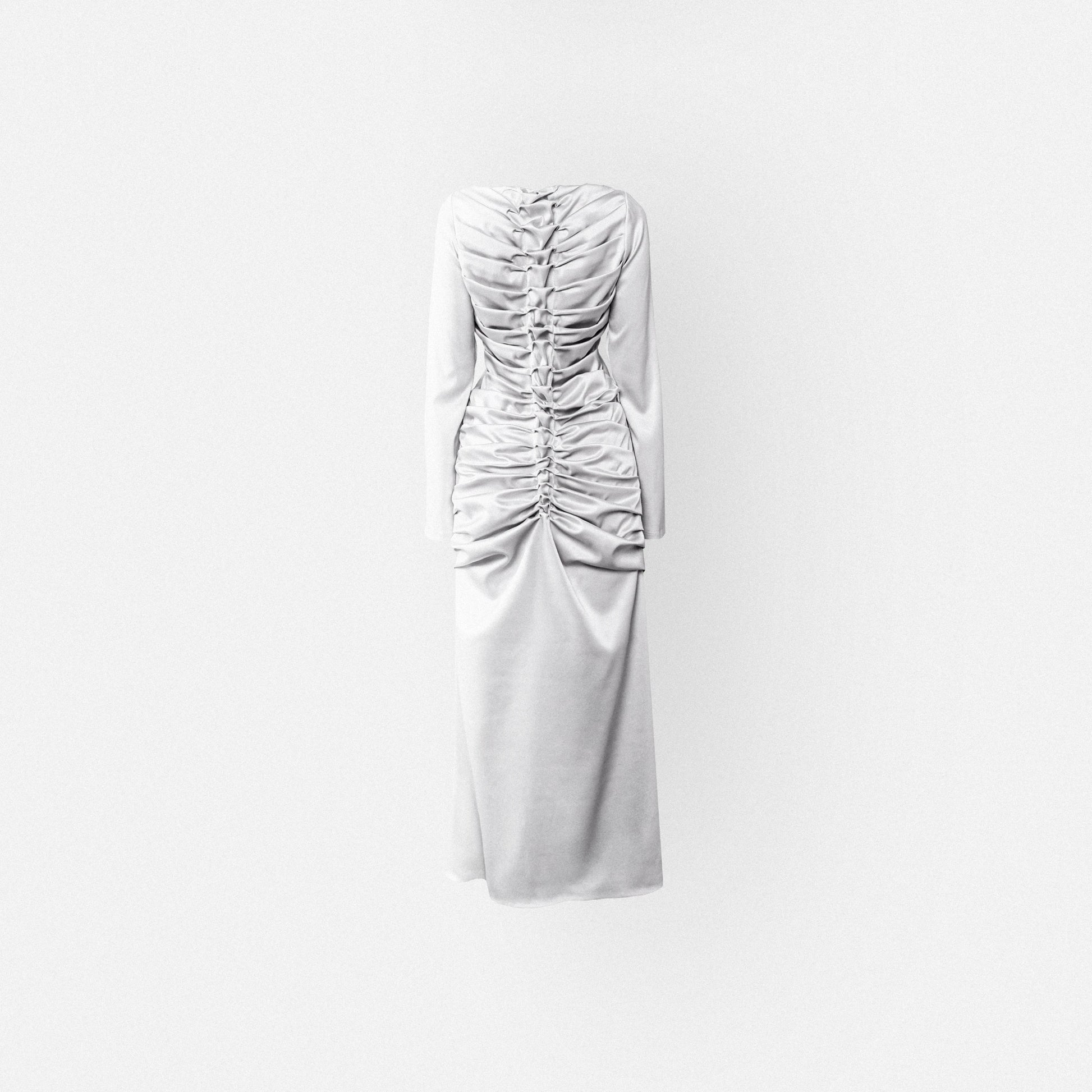 A striking floor-length gown crafted from lustrous satin, designed to captivate with its unique, sculptural details. The minimalist front features a sleek silhouette with long sleeves and clean lines, while the back is adorned with dramatic ruched detailing, mimicking the curvature of a spine for a bold, avant-garde statement.