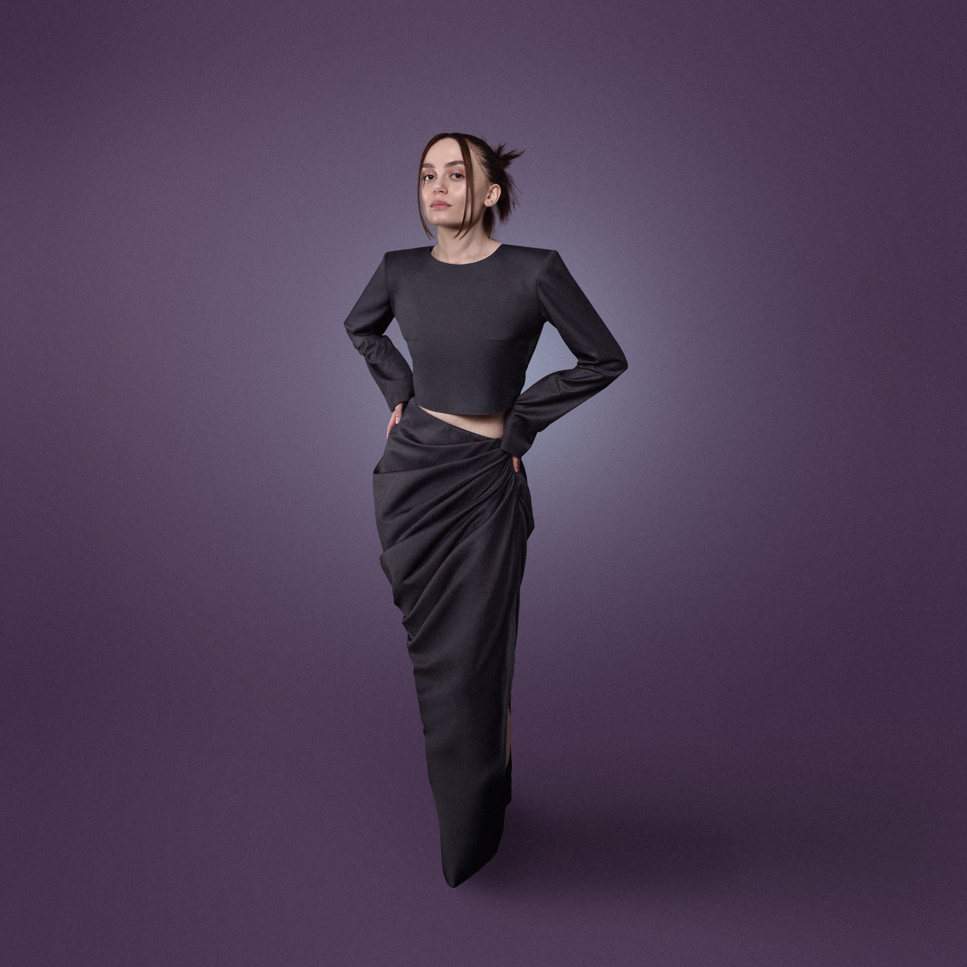 This structured crew neck crop top features clean lines and a bold silhouette, enhanced by sculpted shoulder pads for added structure. Made from luxurious fabric, it combines sophistication with strength.