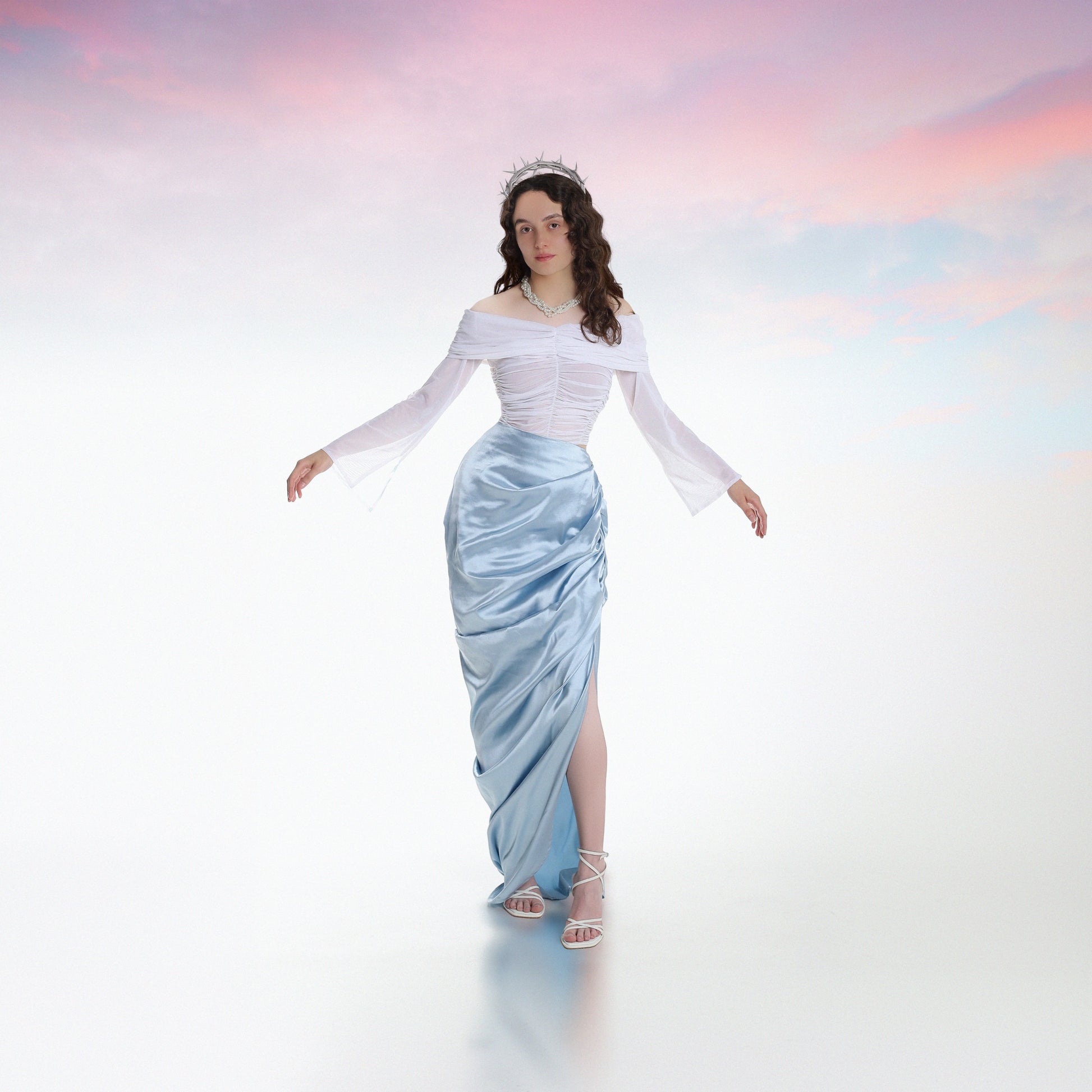 A high-waisted silk skirt with elegant ruched detailing that enhances its luxurious drape. The design features a subtle side slit for effortless movement and a seamless, figure-flattering fit.