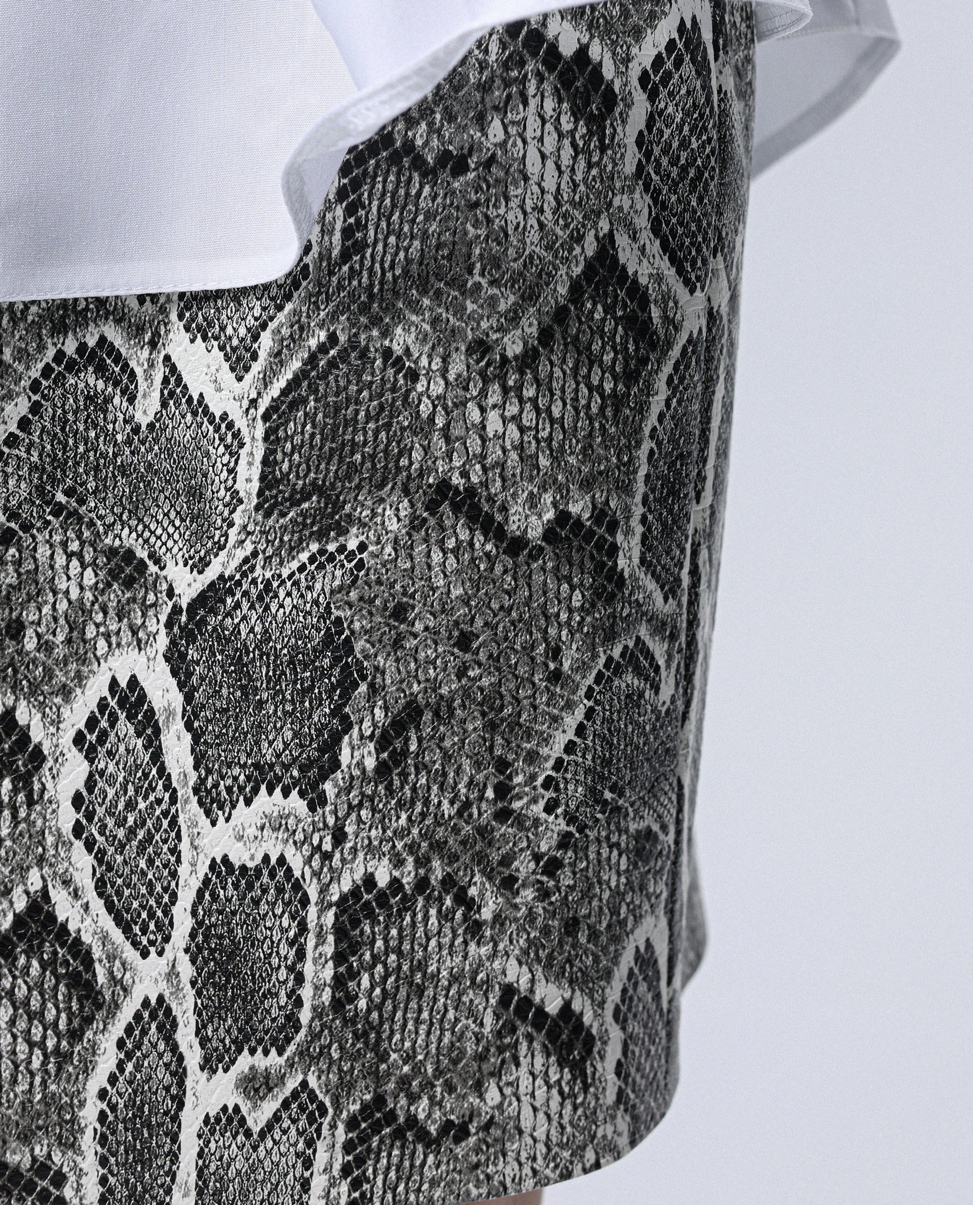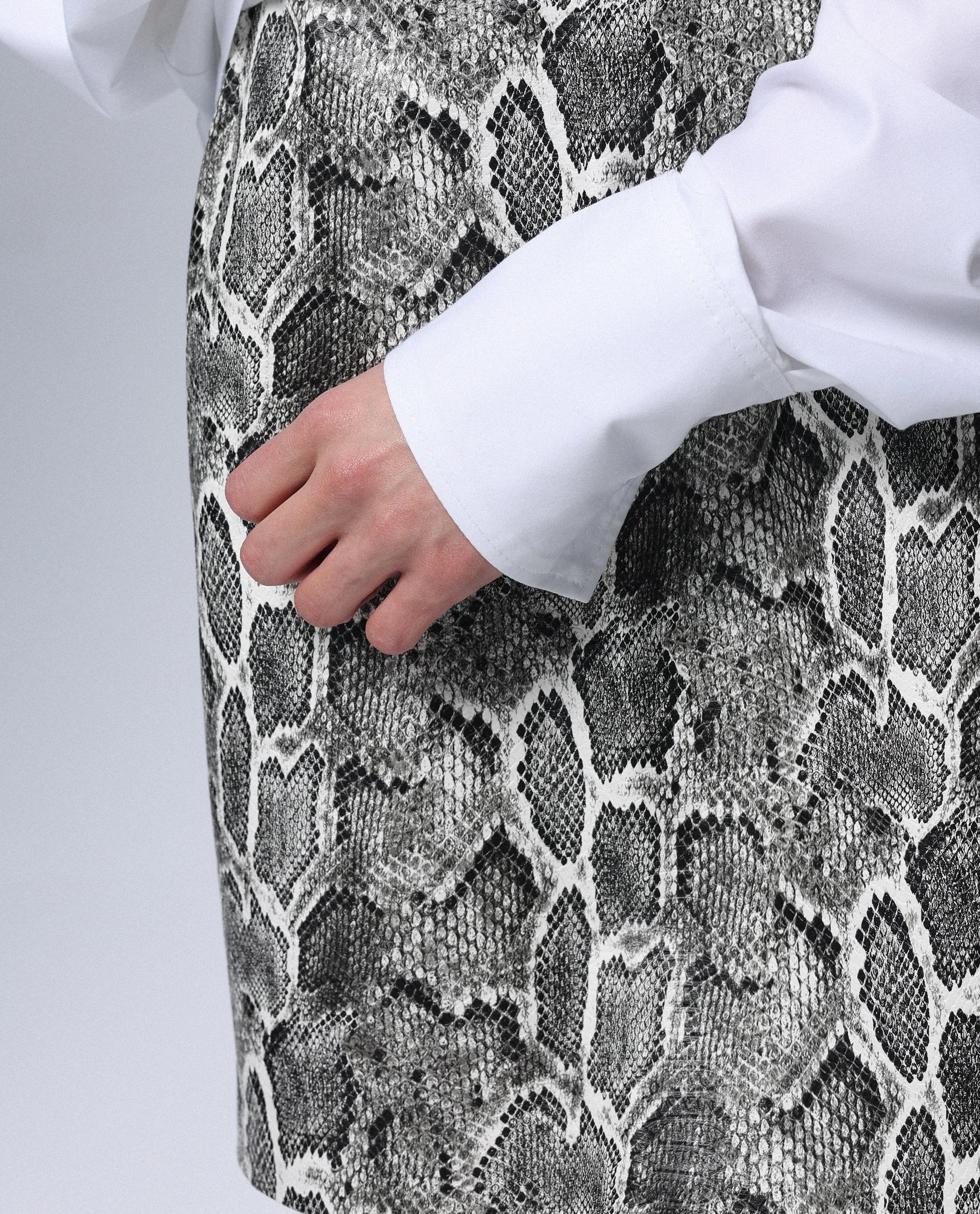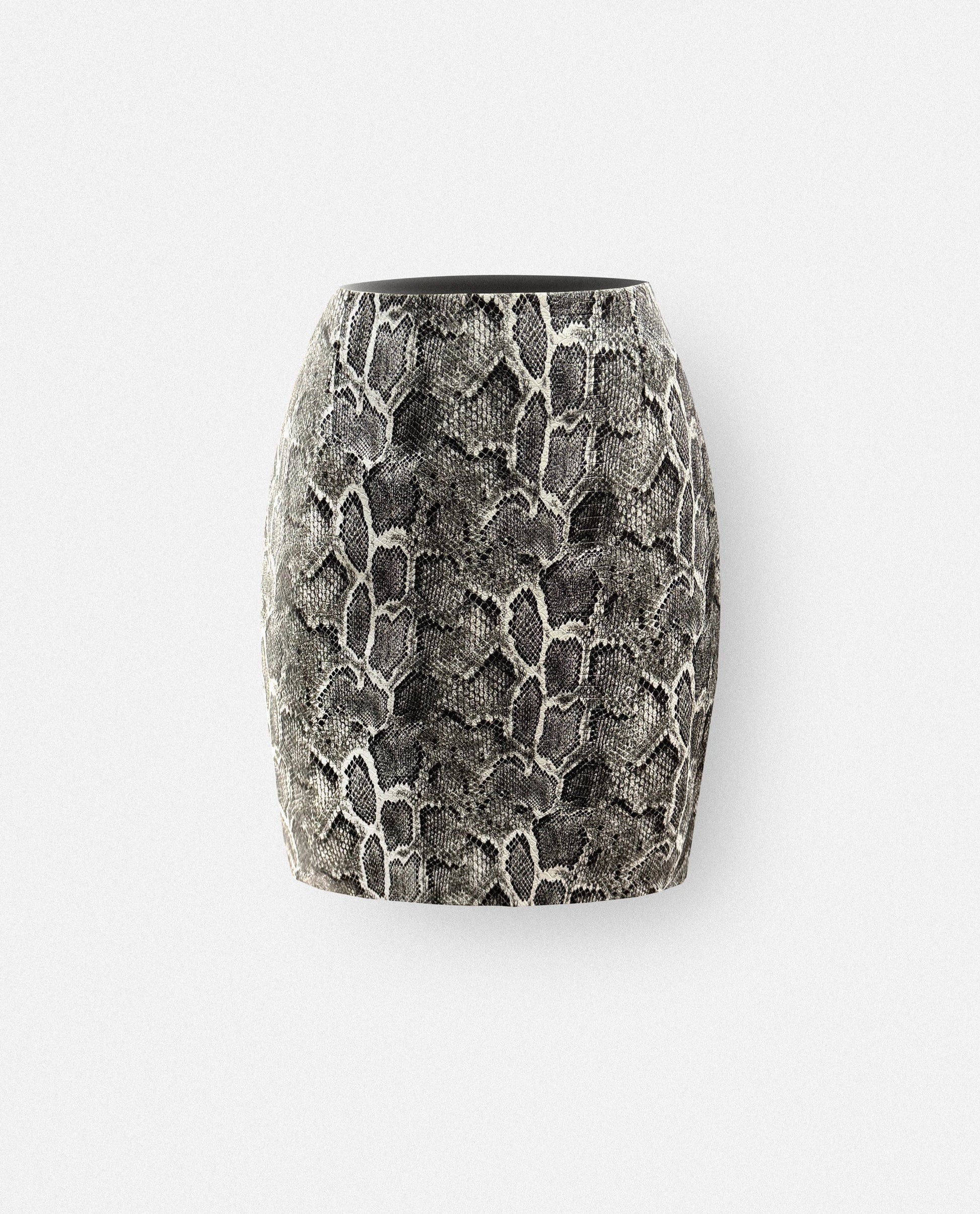 This bold mini skirt features a striking snakeskin texture with a high-gloss finish, delivering a fierce and fashion-forward statement. Its structured silhouette hugs the body for a sleek fit, while the luxe faux leather composition adds depth and edge to your look. Perfect for commanding attention from day to night.
